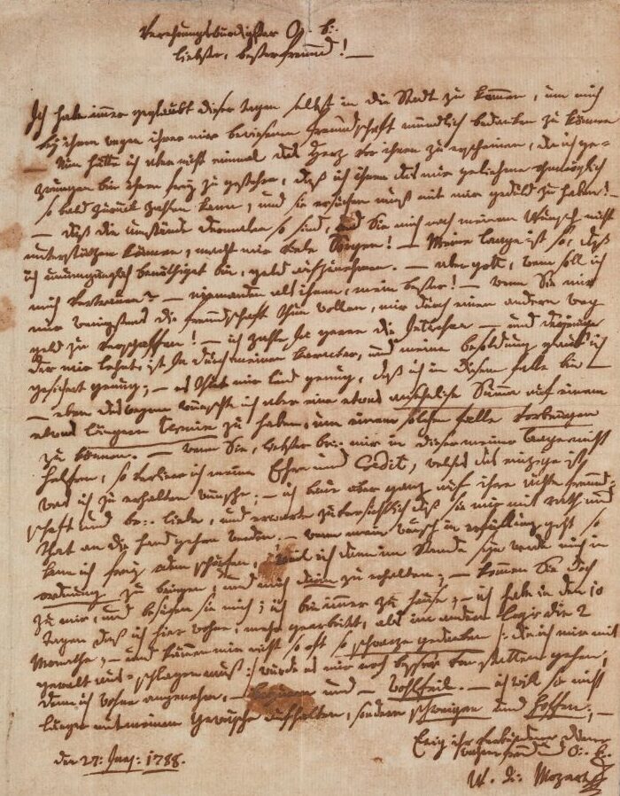 • Zwischen 1788 und seinem Tod schrieb Mozart verschiedene „Bettelbriefe“ an seinen Freund Michael von Puchberg, um Darlehen zu bekommen.